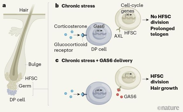 最近,在《自然》杂志上,一篇名为“Corticosterone inhibits GAS6 to govern hair follicle stem-cell quiescence”的文章,在动物水平上,针对具体分子层面对压力与脱发之间的关系进行了探究,阐明了压力与毛囊干细胞功能障碍的内在关联机制。
